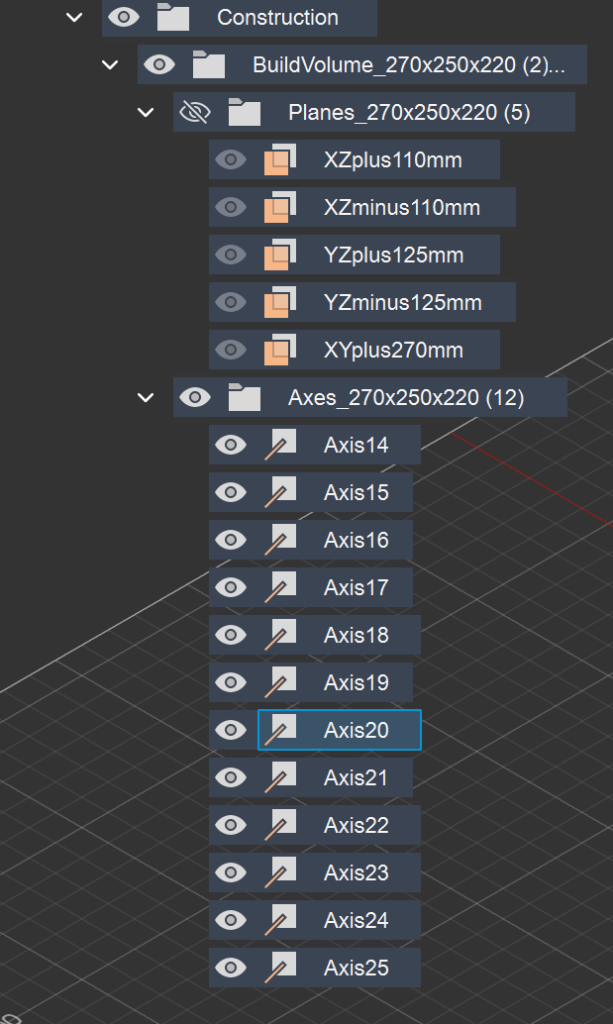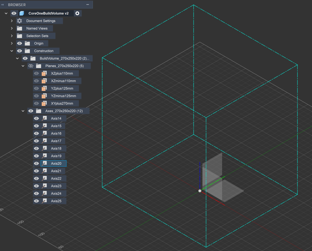 In this file, I have created the planes and axes necessary to visualize the Prusa Core One build volume (270mm x 250mm x 220mm) inside an Autodesk Fusion project. The planes are named and the planes and axes are all grouped in the browser to enable easily turning them on or off as necessary to better evaluate your project’s dimensions.