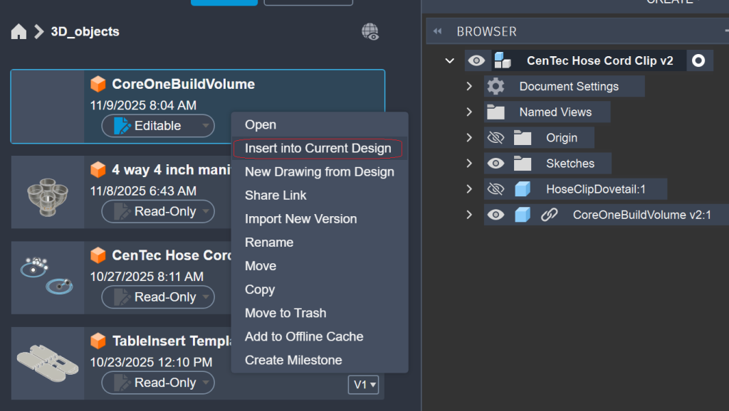 Note: This requires that you have opened the .f3d file containing the build volume constructors at least once, so that it is visible in your Autodesk Fusion Data Panel.